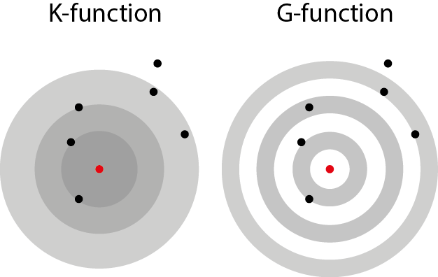G-Function (Pair Correlation Function, Ring-like): The G-function is a variation of the K-function that focuses on specific distances rather than cumulative distances. Instead of looking at all points within a growing circle, it examines points within a narrow ring at a specific distance. This allows it to analyze point concentrations at different geographic scales more precisely.