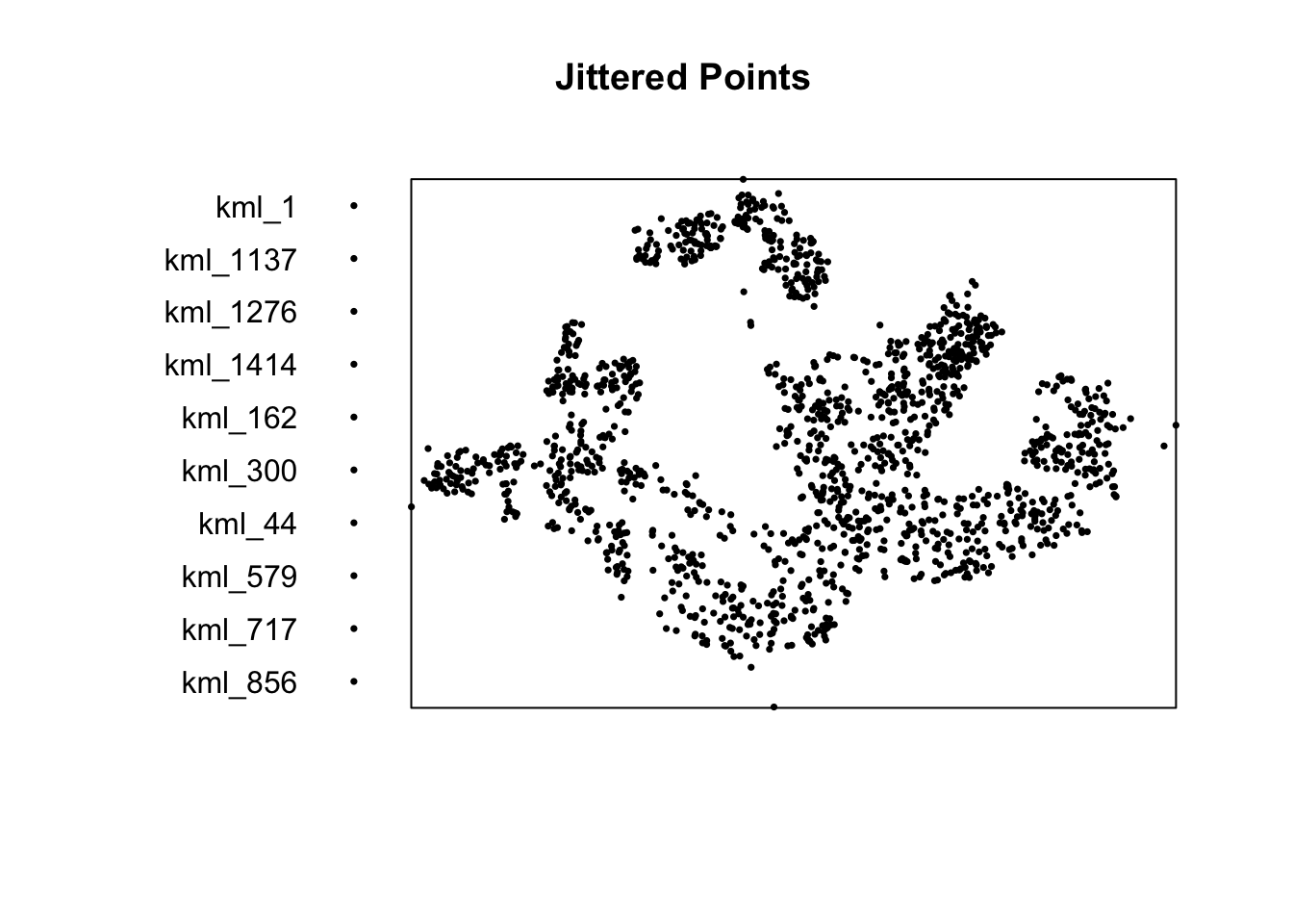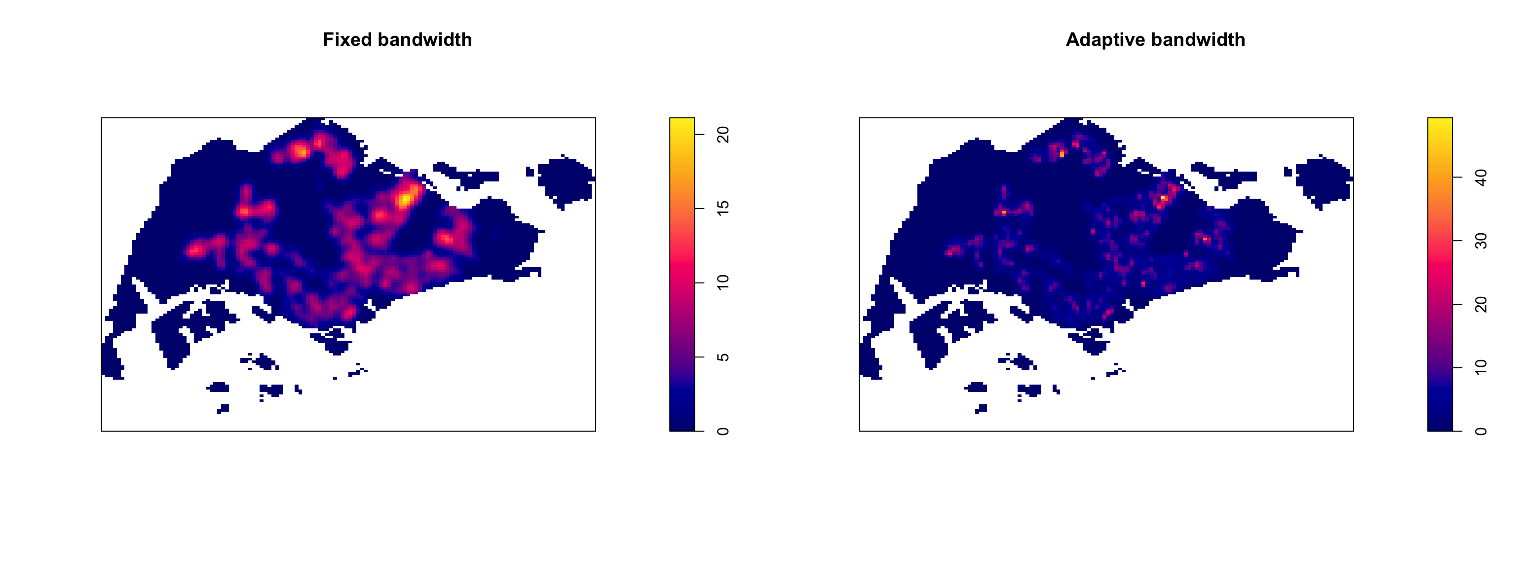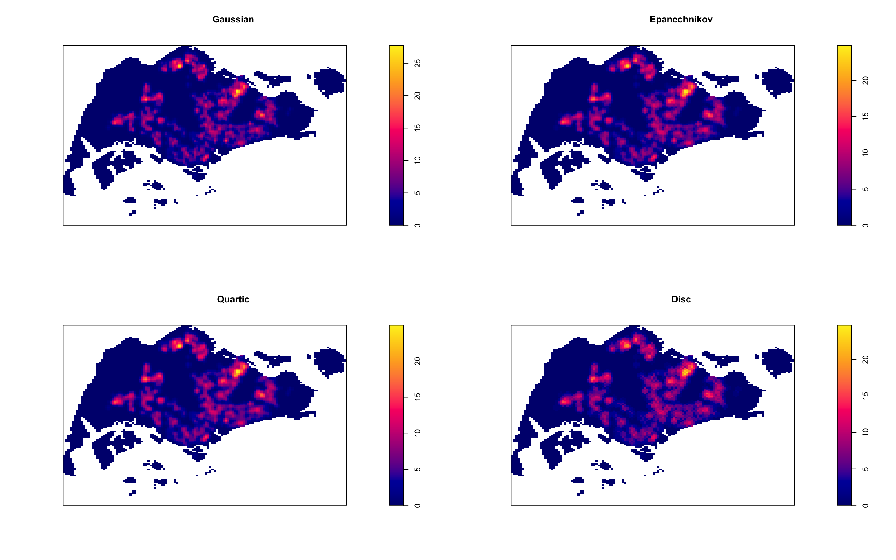 | spatstat | Provides tools for point pattern analysis. | Performing 1st- and 2nd-order spatial point pattern analysis and deriving kernel density estimation (KDE). |