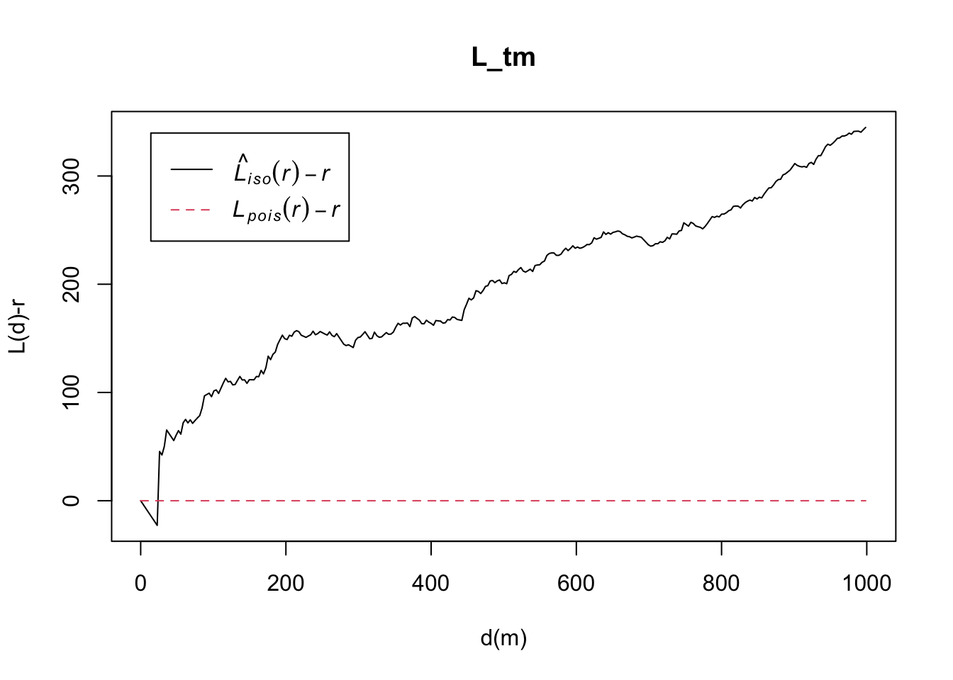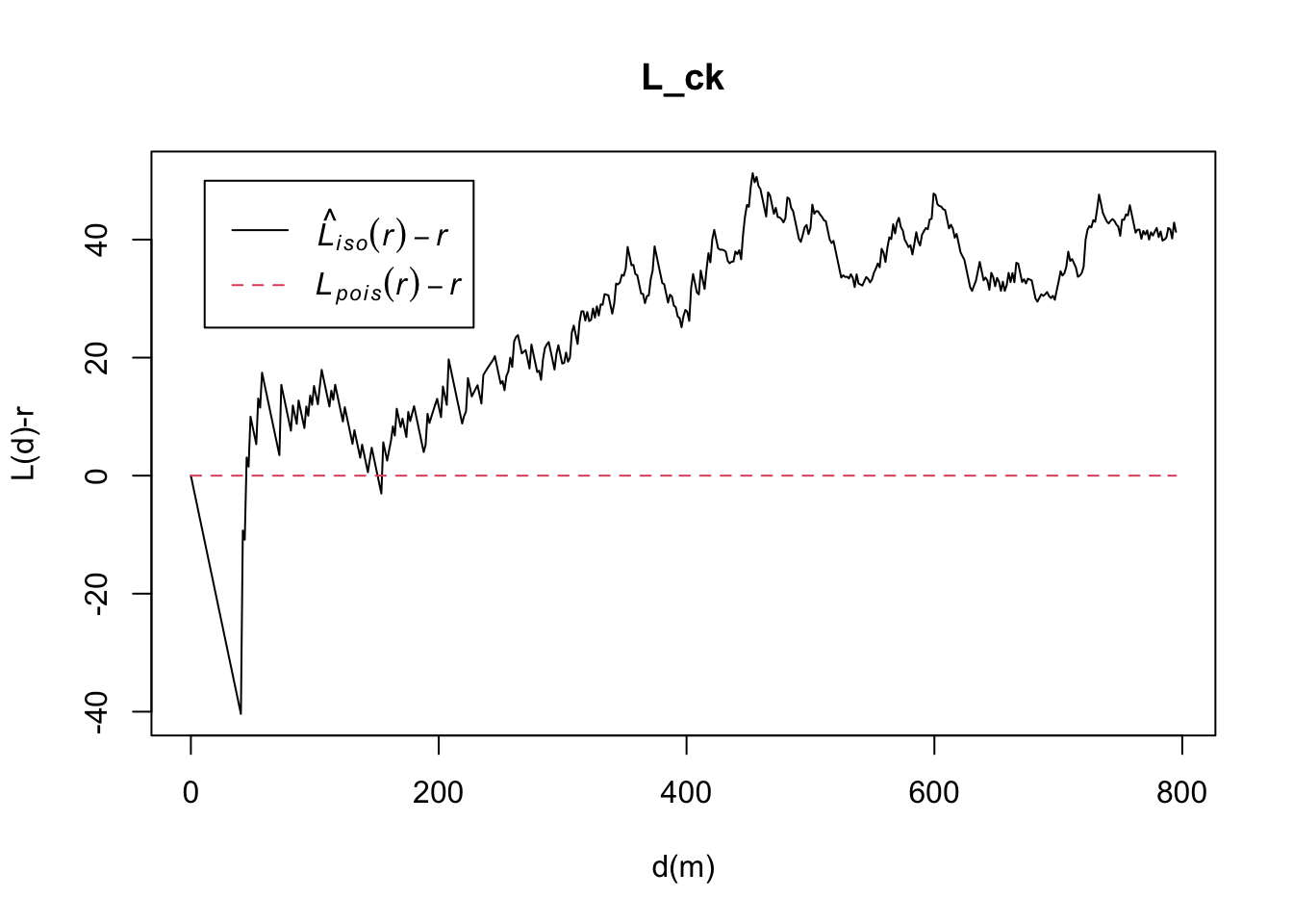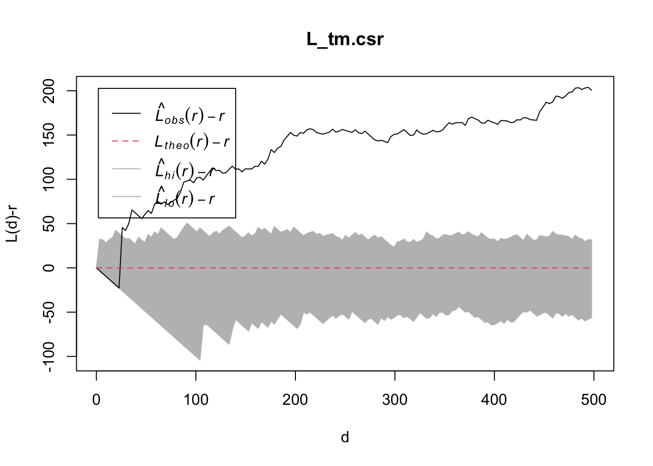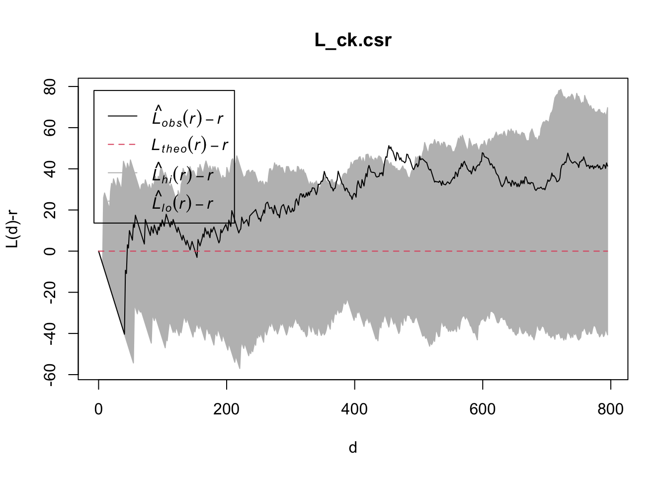 plot(L_ck.csr, . - r ~ r, xlab="d", ylab="L(d)-r")
