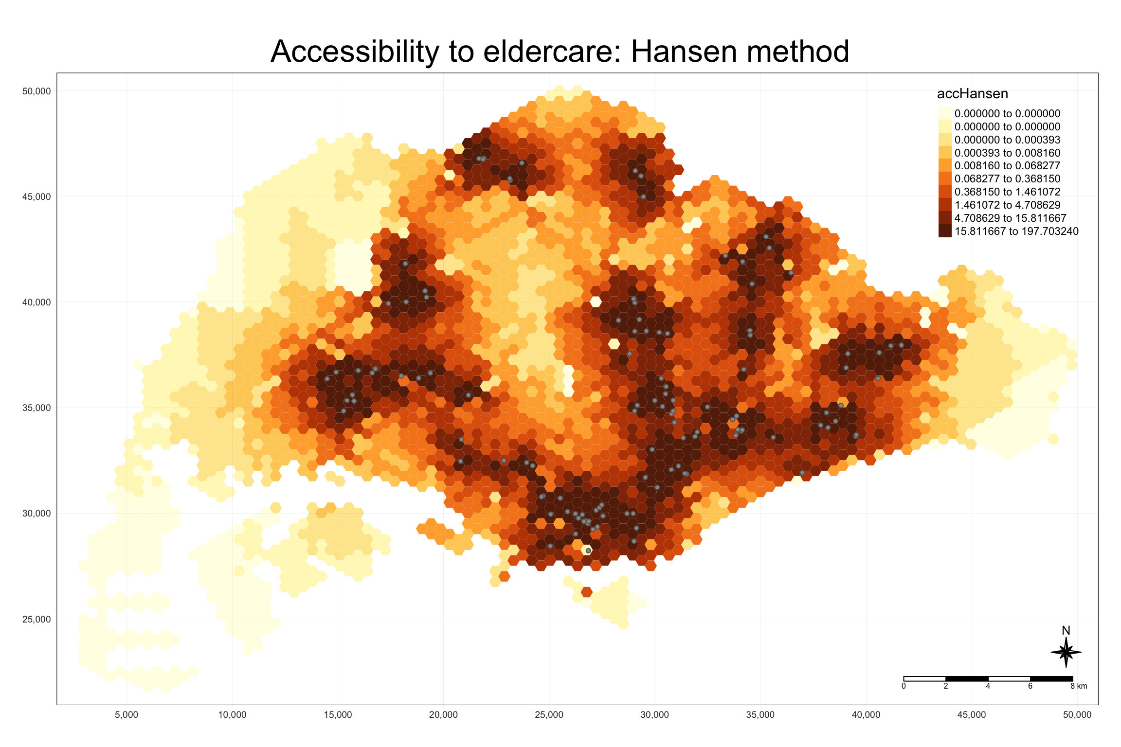 We use tmap to visualize accessibility to eldercare centers with Hansen’s method. The map shows accessibility in Singapore with color-coded hexagons.