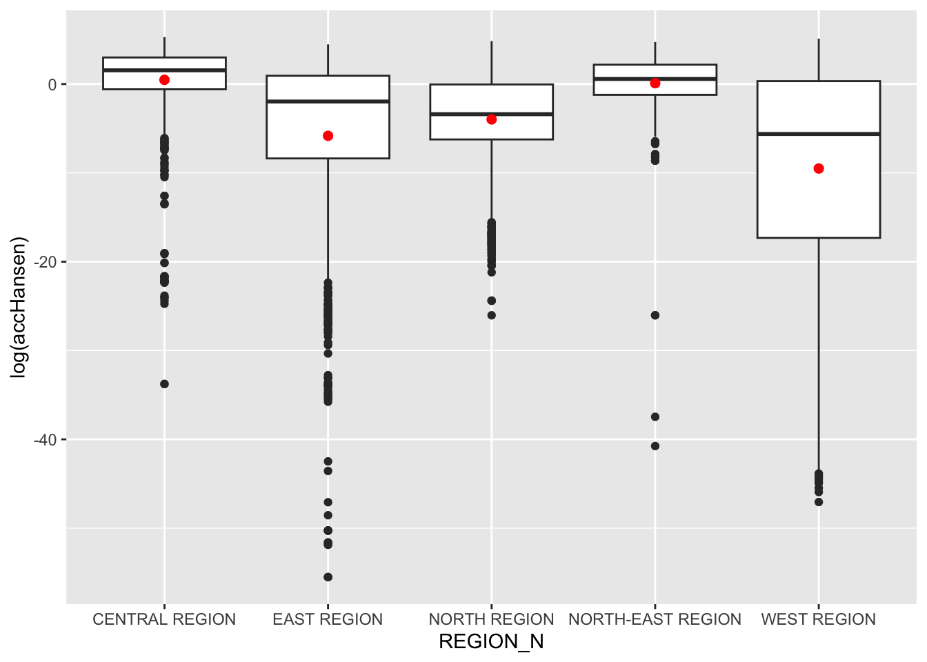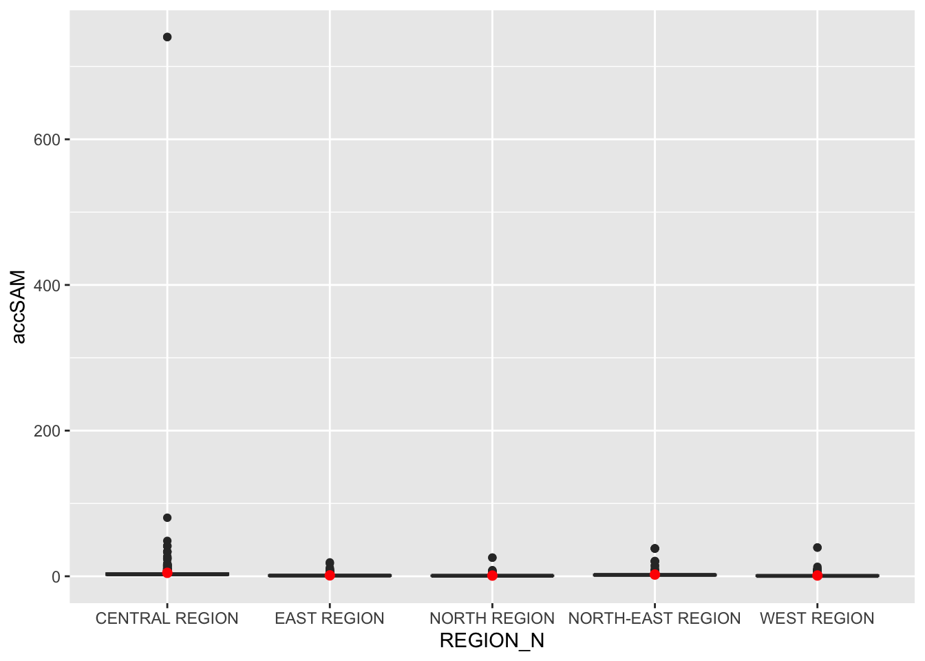 Observations: The Central Region shows the highest and most consistent accessibility, while the West Region exhibits the most variation and lower overall accessibility. The East Region has many outliers, indicating some areas with very low accessibility compared to the rest. The North-East and North Regions show moderate variation, with the North Region exhibiting more negative extremes than the North-East.