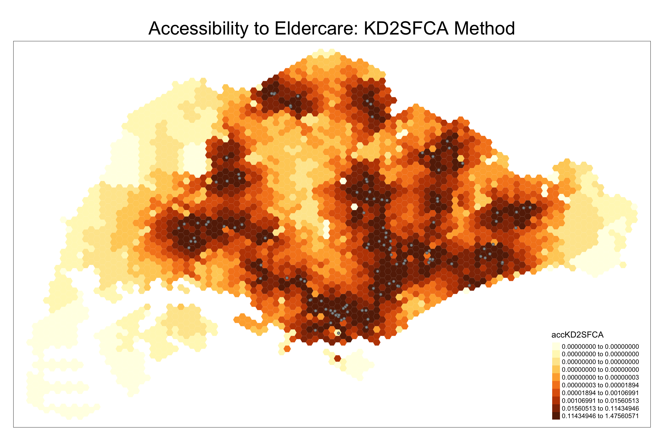tm_layout(main.title = "Accessibility to Eldercare: KD2SFCA Method", main.title.position = "center", main.title.size = 2)