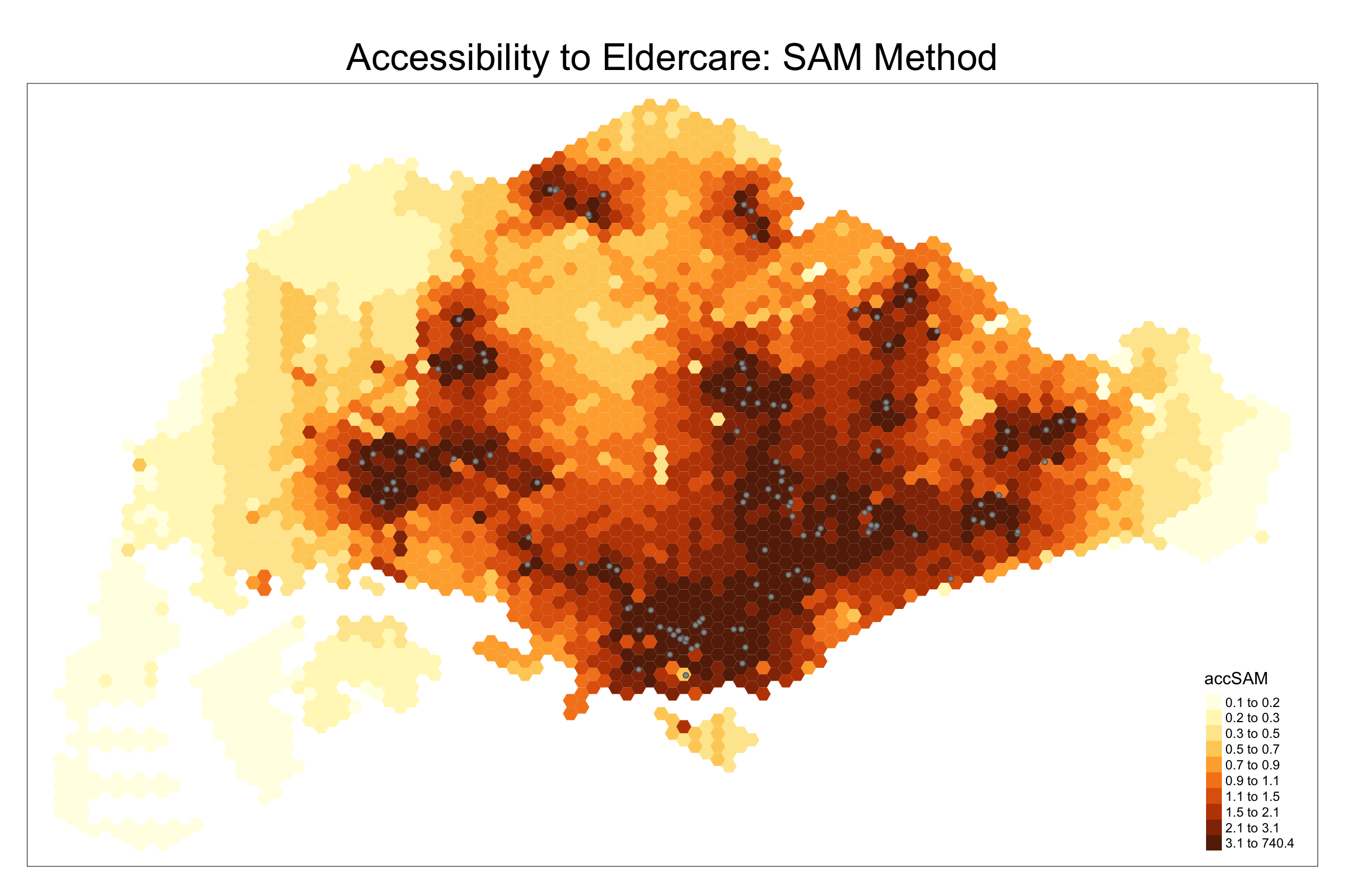 tm_layout(main.title = "Accessibility to Eldercare: SAM Method", main.title.position = "center", main.title.size = 2)