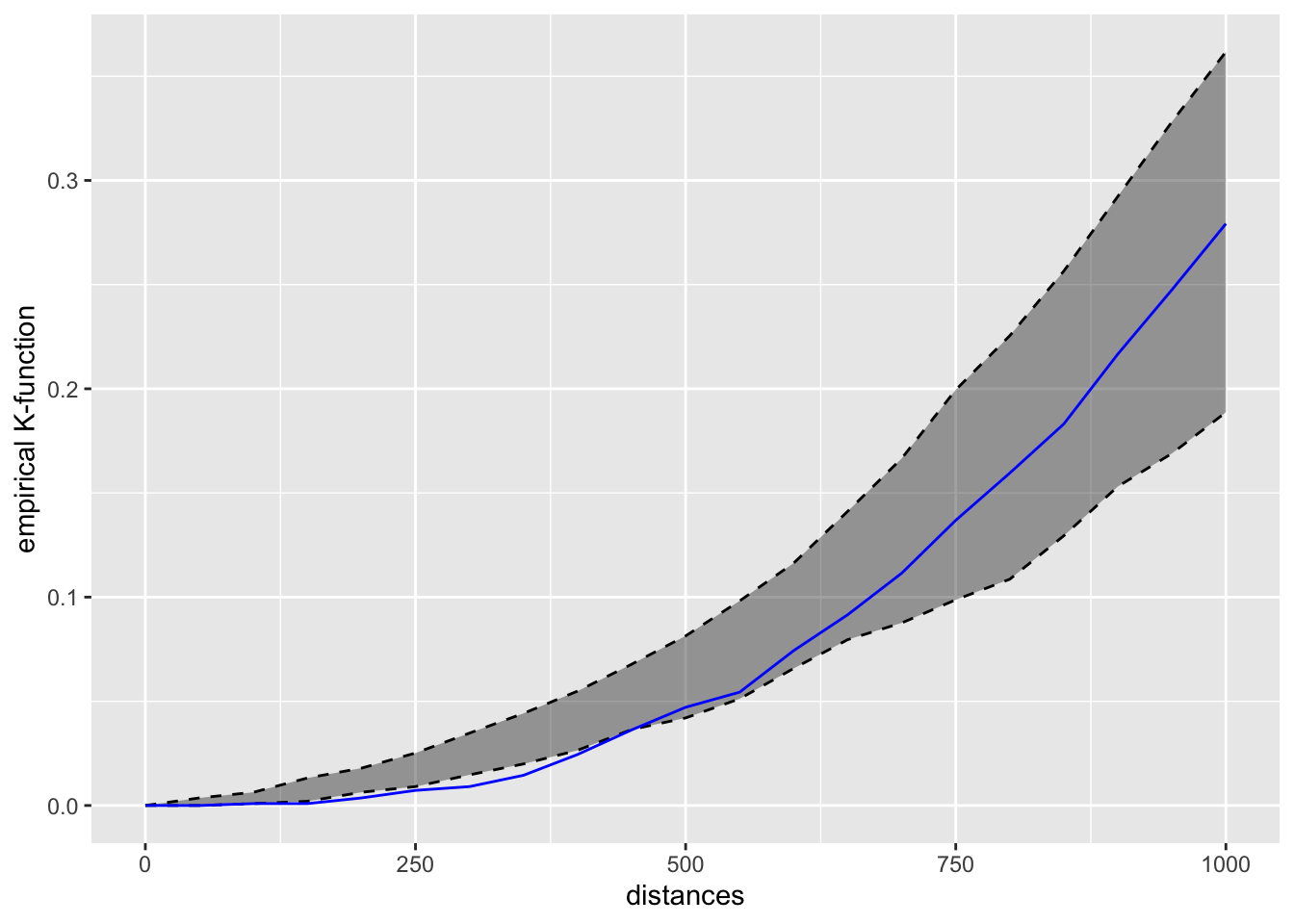 K-Function (Disc-like): The K-function calculates the proportion of points within a distance r from a typical point. It tells us the “average number of neighbors” around each point within that radius. This measure is cumulative, meaning it looks at all points within growing circles (disks) around a point.