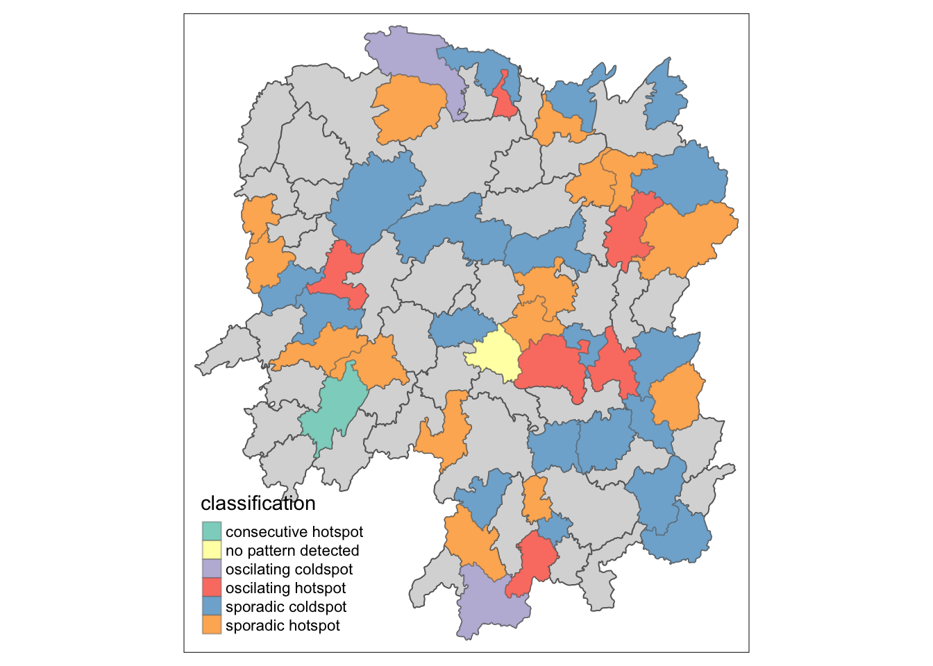 To visualise the geographic distribution EHSA classes, we need to join both hunan and ehsa together before creating the plot. Note that in this case, we have filtered for statistically significant results.